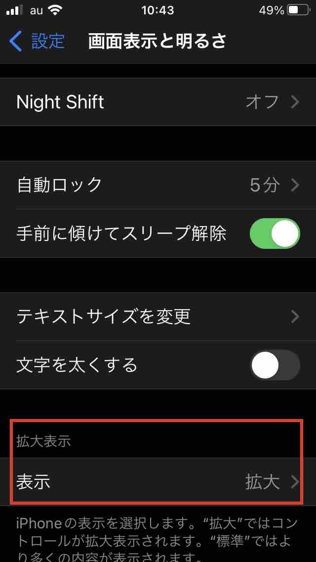 同じ「画面表示と明るさ」の設定の中に「拡大表示」の項目があります。「拡大表示」も「テキストサイズを変更」と同じようにテキストのサイズを大きくします。また「拡大表示」はテキストだけでなくアイコンも大きくすることができます。当然Safariなどのブラウザも拡大されて読みやすくなります。しかし拡大表示では画面に表示できる内容は少なくなります。