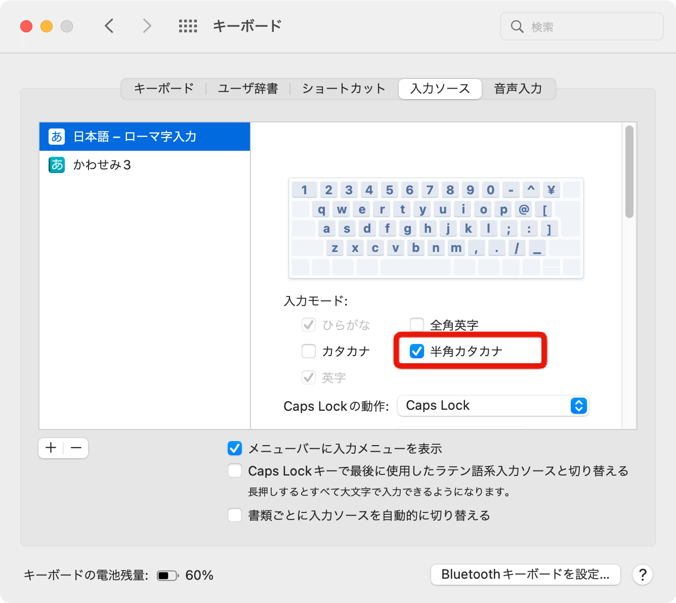 ショートカットoption+Aを使うのにもメニューバーの入力モードに半角カタカナを表示するにもシステム環境設定の「キーボード」で「入力ソース」の半角カタカナにチェックが必要になります。