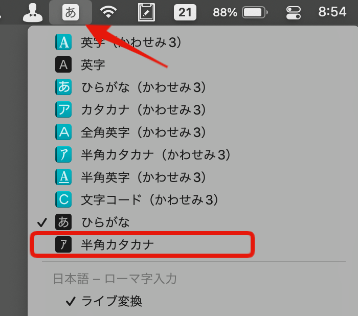 メニューバーの入力モードを事前に半角カタカナに変更しておきます。